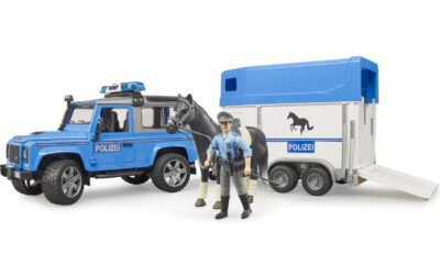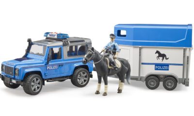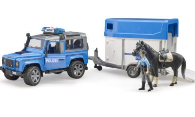 Bruder 02588 je akční policejní sada, která spojuje Land Rover Defender s přívěsem na přepravu koní. Nechybí ani figurka policisty, kůň a funkční světelný a zvukový modul. Perfektní hračka pro děti, které si rády hrají na policejní hlídku, zásah i převoz zvířat.
