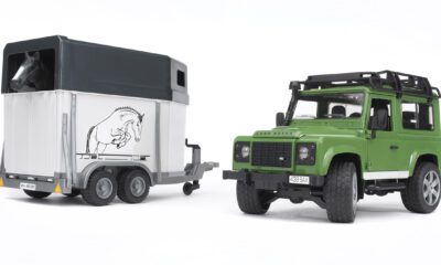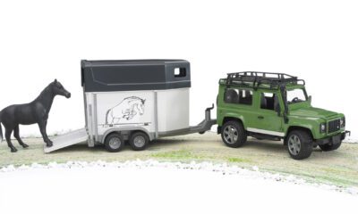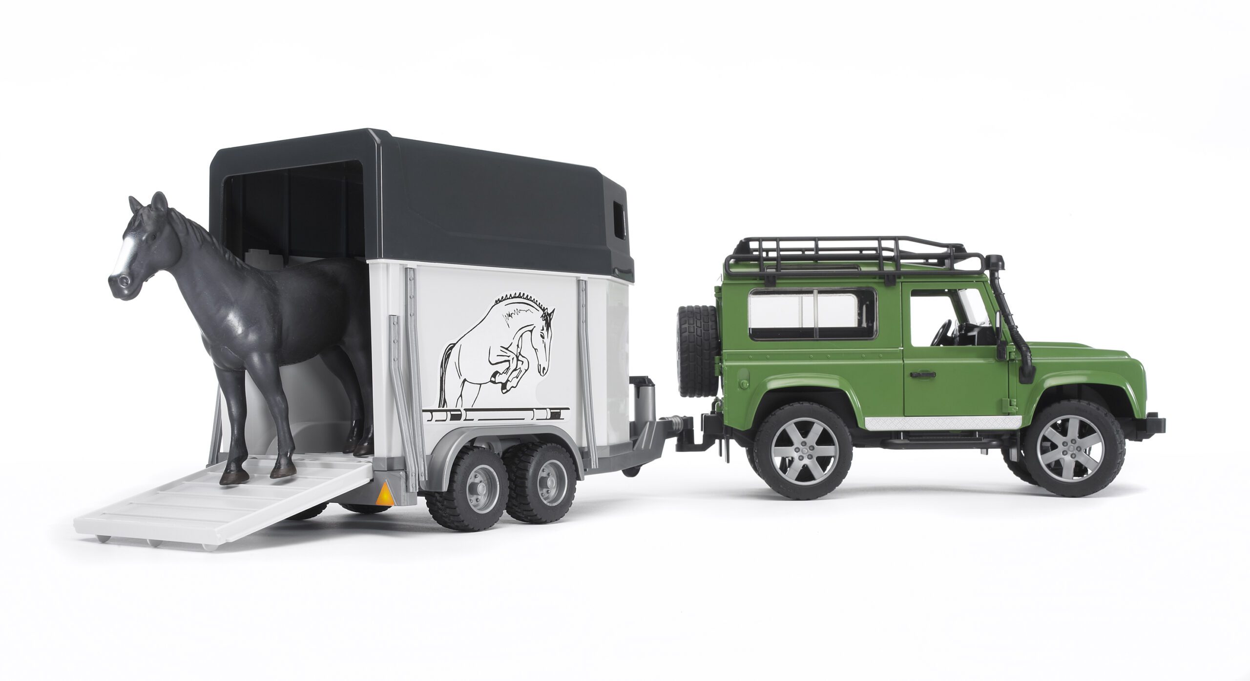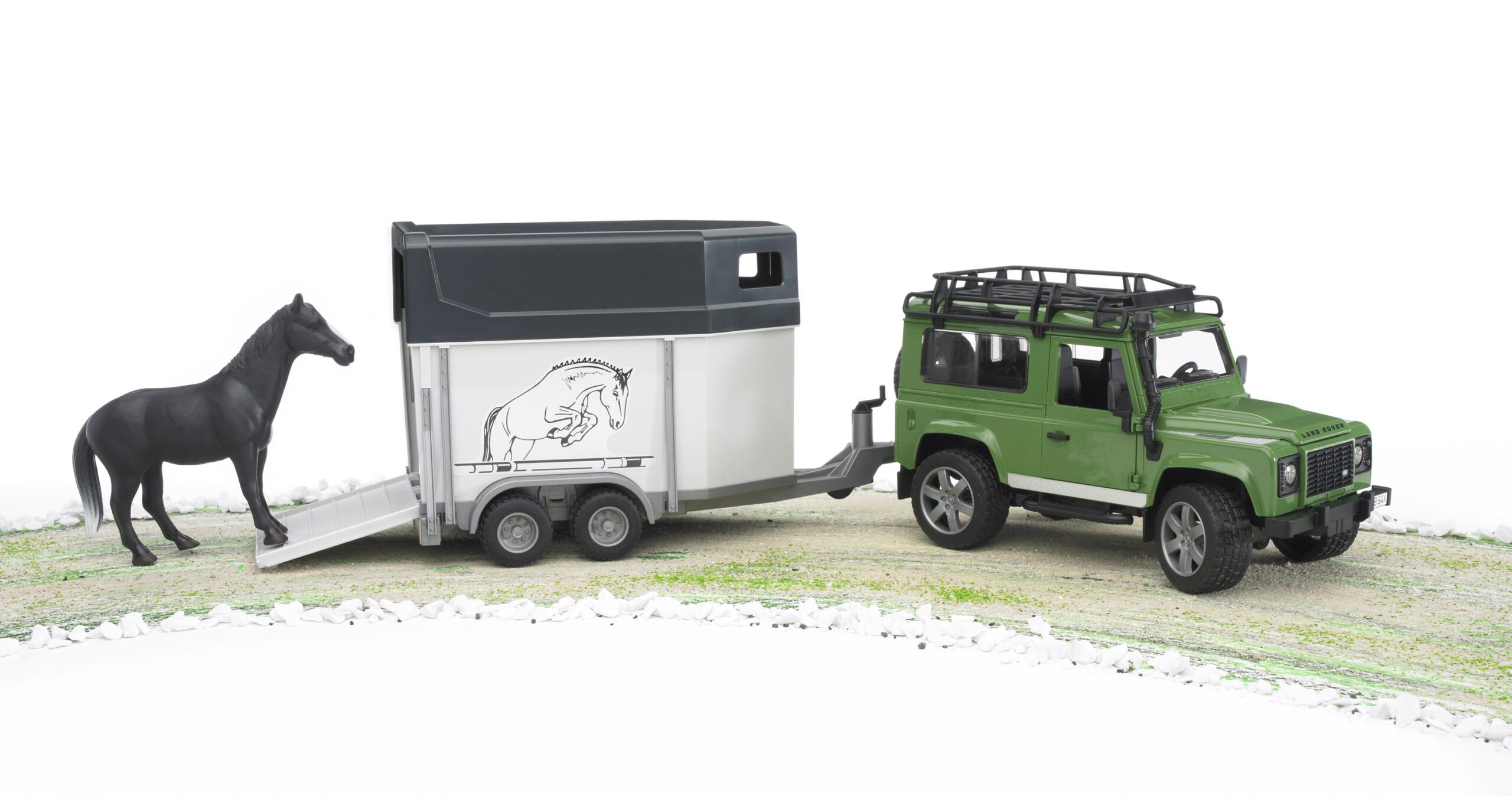 Model Land Roveru má otevírací dveře, kapotu i zadní výklopné dveře, odnímatelnou střechu a řízení přední nápravy pomocí volantu skrz střechu. Přívěs je vybaven nájezdovou rampou a místem pro jednoho koně, kterého lze snadno naložit a vyložit. Celá souprava je kompatibilní s figurkami Bruder – např. jezdci, farmáři či veterináři.