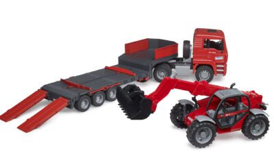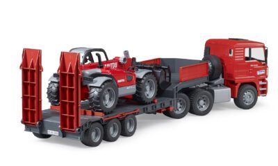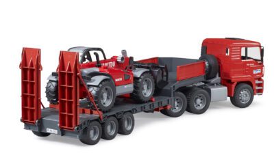 Tahač MAN TGA je vybaven odnímatelným návěsem, který lze snadno sklopit pro pohodlné naložení stroje. Kabina tahače má sklopnou kapotu, otevírací dveře a měkké pneumatiky. Nakladač Manitou MLT 633plně funkční teleskopické rameno, nastavitelnou lžíci a výsuvné podpěry, které zajišťují stabilitu při práci. Oba modely jsou kompatibilní s dalšími auty a figurkami Bruder (nejsou součástí balení).