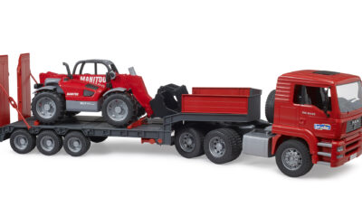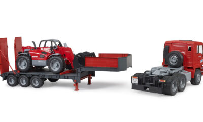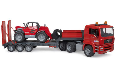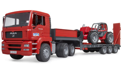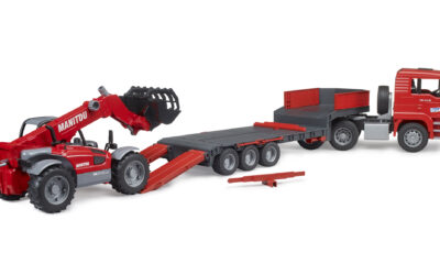Tahač MAN TGA je vybaven odnímatelným návěsem, který lze snadno sklopit pro pohodlné naložení stroje. Kabina tahače má sklopnou kapotu, otevírací dveře a měkké pneumatiky. Nakladač Manitou MLT 633 má plně funkční teleskopické rameno, nastavitelnou lžíci a výsuvné podpěry, které zajišťují stabilitu při práci. Oba modely jsou kompatibilní s dalšími auty a figurkami Bruder (nejsou součástí balení).
