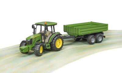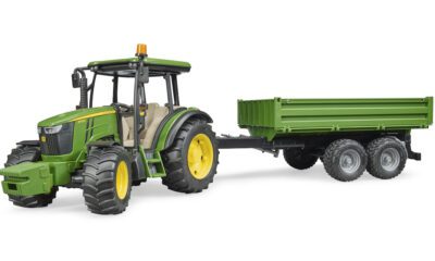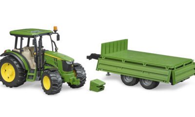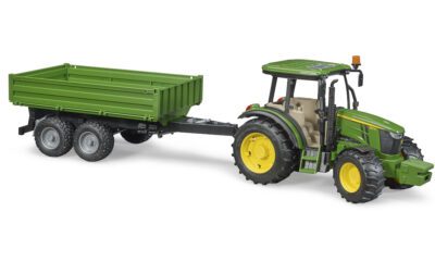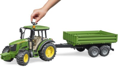 Traktor má odnímatelné čelní závaží, řiditelnou přední nápravu (pomocí prodlouženého volantu přes střechu) a otevírací kapotu motoru. Součástí je také sklápěcí přívěs, který lze vyklápět do tří stran – ideální pro převoz písku, sena nebo jiného nákladu na dětské farmě. Jedinečné spojení značek Bruder John Deere je dnes již mezi dětmi legendární.