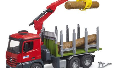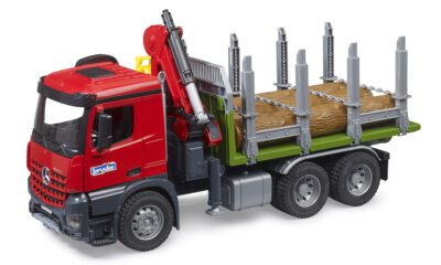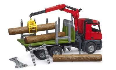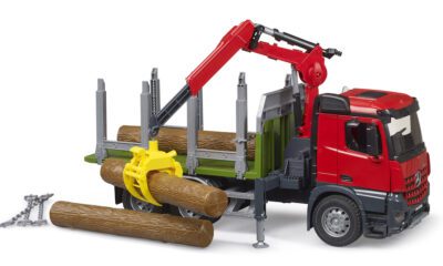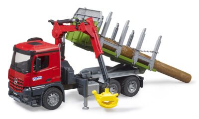 Součástí vozu jsou odnímatelné boční sloupky, které udrží náklad bezpečně na místě, a 3 kusy klád pro ještě realističtější hru. Kabina Mercedes-Benz Arocs má otevírací dveře, sklopná zpětná zrcátka a je kompatibilní s figurkami Bruder. Celý model je vyroben z vysoce kvalitního a odolného plastu.