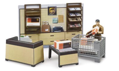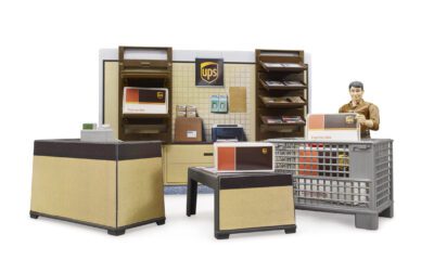 Tato UPS pobočka obsahuje vše, co malí doručovatelé potřebují: pracovní pult, třídící boxy, ruční vozík, skener, figurku zaměstnance UPS a další doplňky. Skvěle se kombinuje s Bruder UPS dodávkami a dalšími sadami bworld.