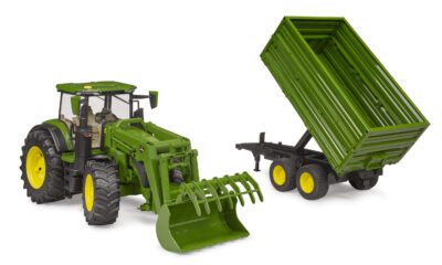 Model má otevírací dveře a kapotu motoru, plně ovladatelný čelní nakladač, řiditelnou nápravu pomocí volantu přes střechu a zadní závěs pro připojení přívěsu nebo dalšího příslušenství Bruder. Robustní sklápěcí přívěs s výklopnými bočnicemi umožňuje snadné nakládání a vykládání nákladu. Vše v designu slavné značky John Deere.