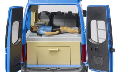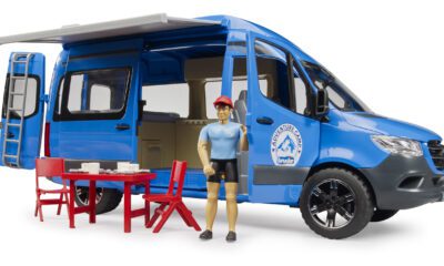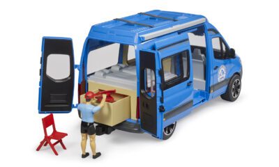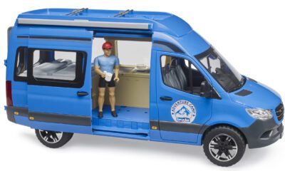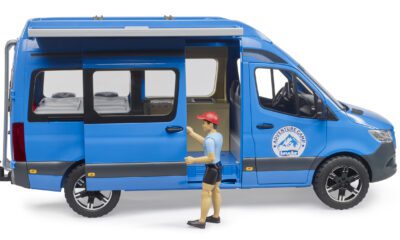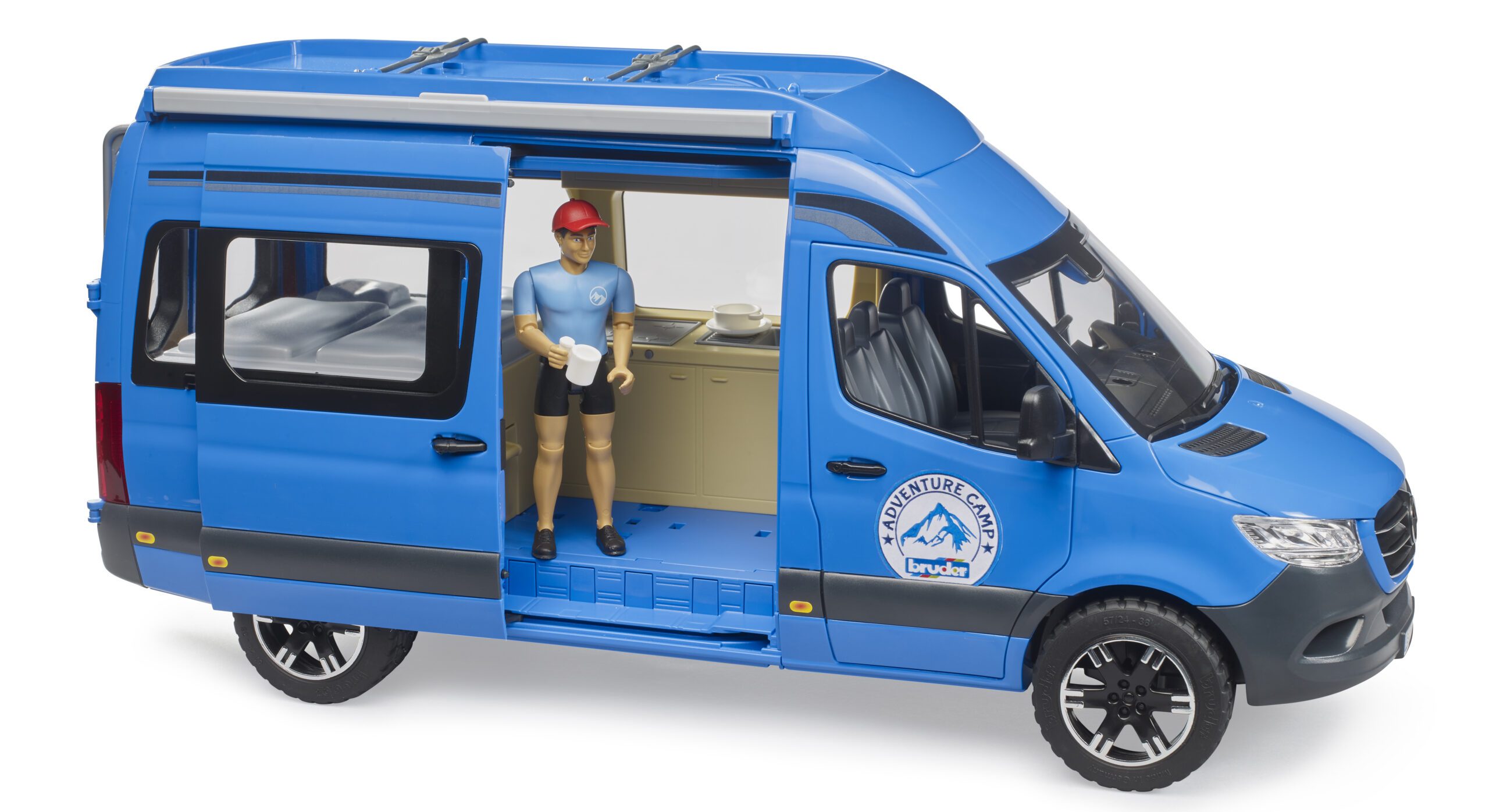 Tento kempingový MB Sprinter Bruder v měřítku 1:16 má otevírací dveře, odnímatelnou střechu a detailně propracovaný interiér s kuchyňkou a posezením. Součástí je figurka řidiče, skládací židle, stůl, nádobí i jídlo, takže děti mohou okamžitě vyrazit na dovolenou.
