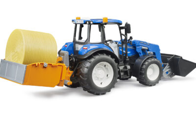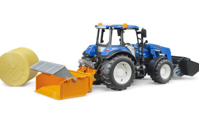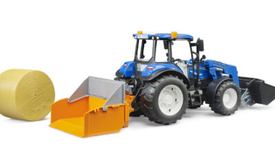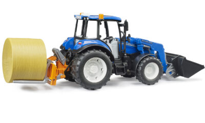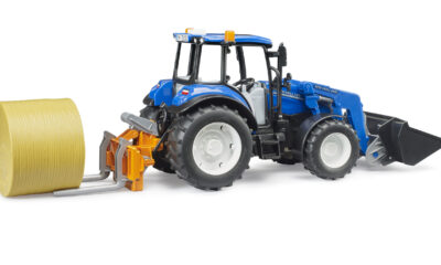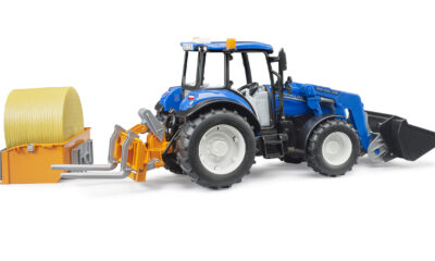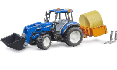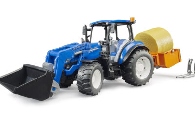 Traktor New Holland T5.120 má řiditelnou přední nápravu, otevíratelnou kapotu motoru a robustní terénní kola. Čelní nakladač se snadno ovládá a umožňuje nabírat a přemísťovat materiál. Součástí balení je také sklápěcí box pro převoz nákladu a vidle na balíky, díky nimž lze simulovat práci se senem a slámou.